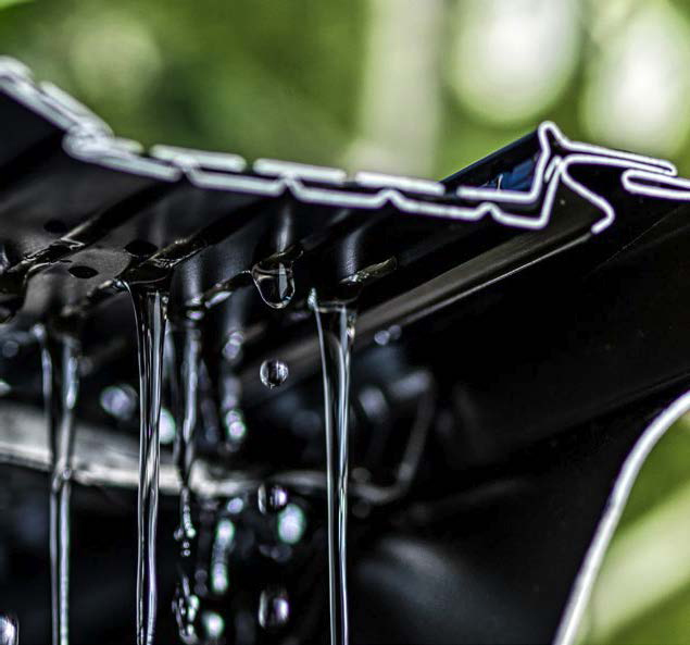 Additionally, the exclusive design of Alu-Rex products features an approximately 0.4 in. (1 cm) deep basin. Testing in the lab and in the field has shown this to be the right depth to catch more water without stopping the wind from doing its job of sweeping away leaves, pine needles, and debris from the surface.